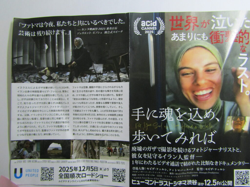 このHPの、前ブログに続いて再びドキュメンタリー映画の紹介と感想である。この映画は、イラン出身の映画監督セビデ・ファルシが、封鎖されたガザで人々の生活実態を発信し続けるパレスチナ人ジャーナリストのファトマ・ハッスーナと連絡をとり、ビデオ通話を中心としてガザの実態を報告し続ける映画である。