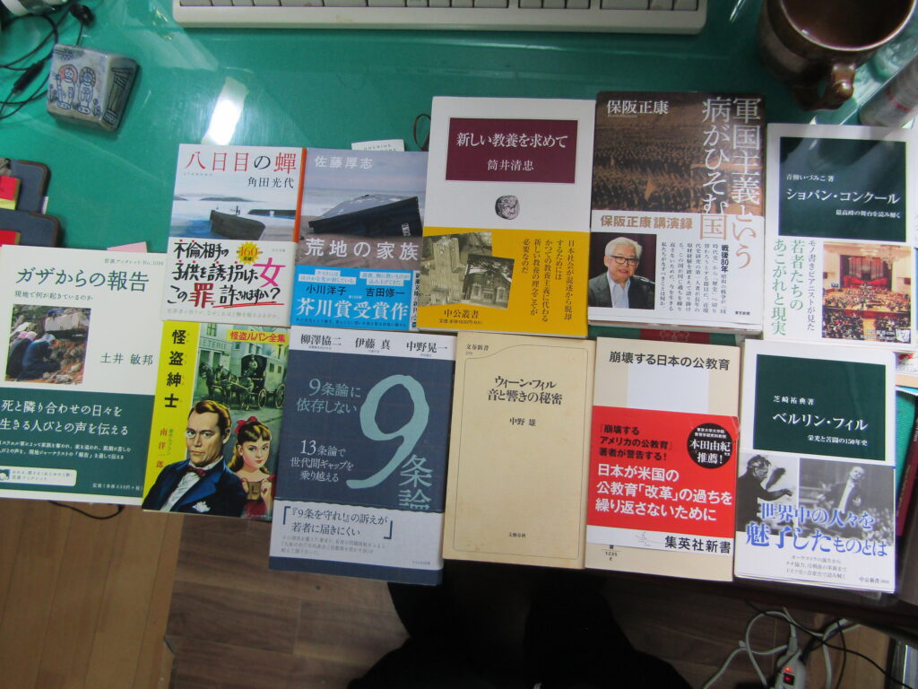 この期間も、あえて研究活動から離れて、自由気ままに読書を楽しみました。まずは写真右上の音楽関係から。青柳いづみこ『ショパンコンクール』。筆者には申し訳ありませんが退屈でした。2015年開催の第17回のコンクールに焦点を合わせたのはいいのですがエントリーした演奏家一人一人の演奏についての評論には閉口しました。この本を購入して「ショパンコンクール」について知りたかったのはそこでは無かったのですが。●右下芝崎拓典『ベルリン・フィル』はとても面白かったです。世界最高のオーケストラが誕生して以降、時代の波に翻弄されながら今日にまできた様子が非常に面白く読めました。●右二列目、保坂正康先生『軍国主義という病がひそむ国』は非常に勉強になりました。今年は昭和100年・戦後80年の節目の年。今年こそ過去の歴史から何を学ぶべきかが真剣に問われる年でした。にも関わらず、物騒な発言をする人物が首相になるなど、きな臭い状況が続いています。本書で、保坂さんは、「太平洋戦争から学ぶべき教訓としてシビリアンコントロールの重要性・先の戦争が日本文化や伝統に反していること、国際ルールを完全に無視し日本文化を曲解して死を強制したこと」を指摘します。●鈴木大裕先生『崩壊する日本の公教育』。アメリカの公教育の現実に詳しい著者が米国追随方の日本の公教育のあり方に警鐘をならす一冊。●筒井清忠先生『新しい教養を求めて』は、混迷する現代日本社会に対し、「新たな教養」を提起する模索の書。●中野雄先生『ウィーン・フィル音と音楽の世界』はウィーン・フィルハーモニー管弦楽団の「音の美しさと伝統」を分かりやすく掘り下げた好著。文学作品から2冊。●佐藤厚志氏『荒地の家族』。大震災で失われたものの快復とは何かを鋭く説いた芥川賞受賞作品。●角田光代氏『八日目の蝉』は不倫相手の子どもを誘拐・逃避行するという人間愛溢れる作品。●柳澤協二氏他『9条論に依存しない9条論』は、特に「最近の若い人に『9条を守る』が通用しない」という危機認識の下で若い世代が何を求めているか、を率直に語り合うとても有意義な好著。●ルブラン著『怪盗紳士』は私が小学生の時の愛読書・シリーズの一冊、アマゾンで発見し懐かしくなって購入・読んだ本。●土井敏邦『ガザからの報告』はジャーナリストによる現地からのリアルなリポート。ガザでは今何が起こっているのか実態をリアルに知ることができる一冊。