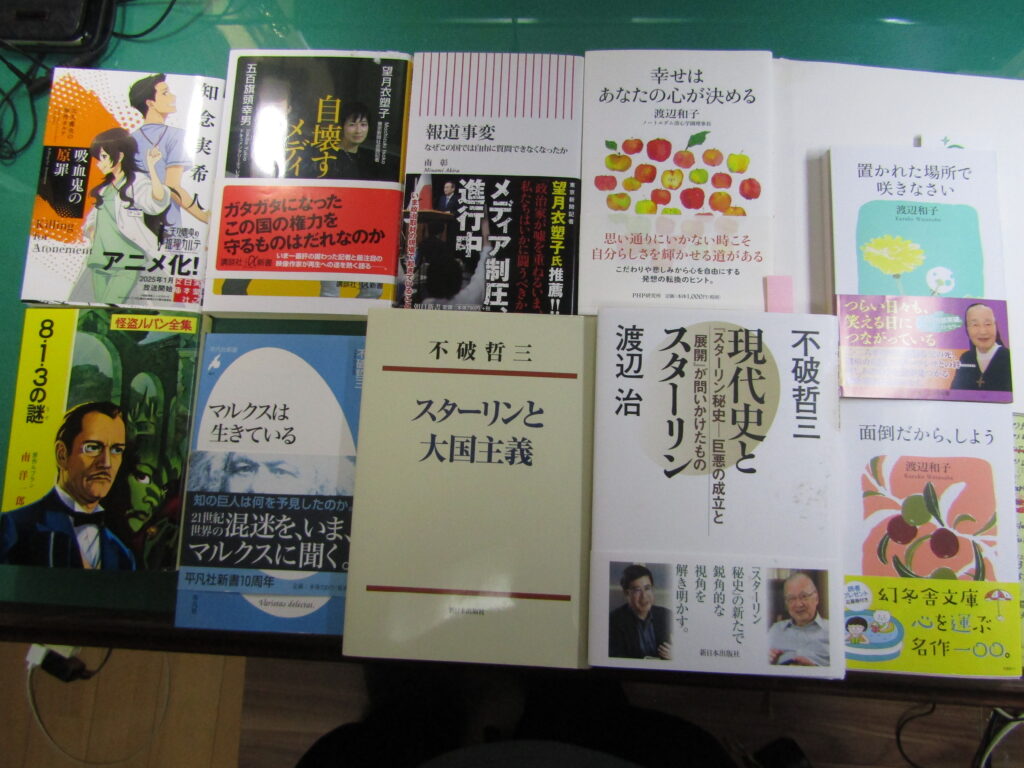 昨年末に不破哲三さんがお亡くなりになった。私にとって不破さんは、共産党の指導者としてよりも一人の知識人として強い印象が残る。丁度50年前、私が20歳の時に、アルバイトしている本屋に突然やってこられ、そこで少し立ち話ができたことがよい思い出である。同じ頃に知ることになる加藤周一氏と同じく、不破さんの書籍に影響を強く受けてきた。不破さんが書かれた書物は(1)マルクス主義の古典の解説、(2)広い意味での共産党の政策論、(3)小林多喜二・宮本百合子の文学論、及び水上勉さんとの共著、(4)その他、に区分できよう。亡くなられて読みたいと思ったのは1982年刊行の『スターリンと大国主義』である。その後に研究を発展させ、それらの成果が力作『スターリン秘話』(全6巻)として刊行される(2015年~)。そのダイジェスト版ともいうべき渡辺治氏との共著『現代史とスターリン』(2017年刊行)を今回初めて読んだ。まさに現代史を書き換えるような説の連続で本当に面白かった。不破さんの御冥福をお祈りするとともに、今月以降、不破さんの文学論や文化芸術論も読もうと思っている。左列推理小説2冊は単なる気晴らし。もう少しの間、自由な読書を楽しみつつ、その後に日本国憲法についてテーマを絞って読書してみようと思っている。