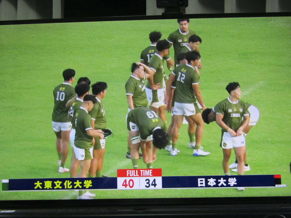 タックルやスクラムにもよいプレーが出ていました。後半は、前半の修正が見事にいきて大東ペースで展開し、60分についに逆転トライ。最後は40-34でかろうじて勝利を得ることができました。